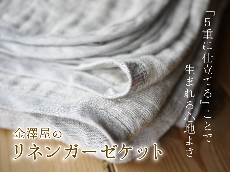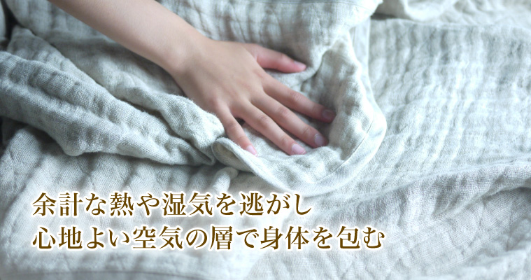 吸水や発散の力は綿の4倍といわれ、ざっくり織り上げた五重のガーゼのケットにすることで、じめっとしにくい、心地よい空気の層で身体を包み込みます。