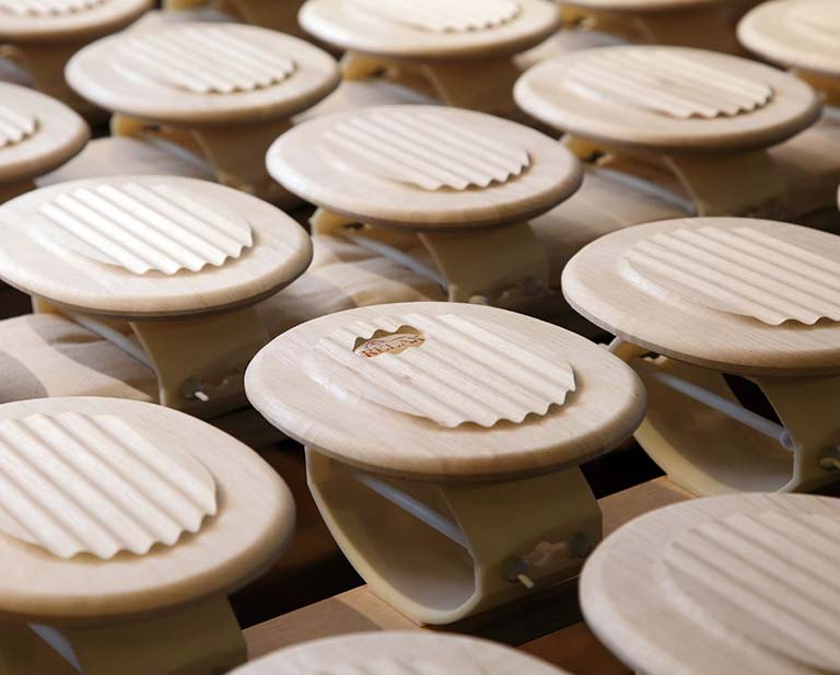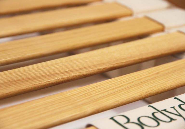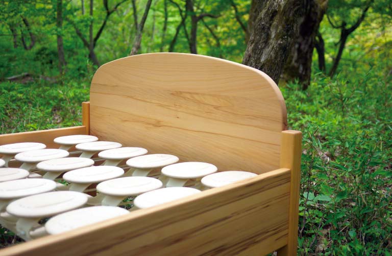日本で現在主流となっている金属のコイルスプリングは、クッション性があり、かつ比較的安価なコストで製作できるため多く出回っていますが、廃棄されるときに大量のゴミを出します。金澤屋が提案する「ウッドスプリング」の主な素材は、無垢ブナ板とラテックス(天然ゴム)。それぞれが優れた機能性を持ちながらやがて土に還る、身体と環境にやさしい素材を使用しています。