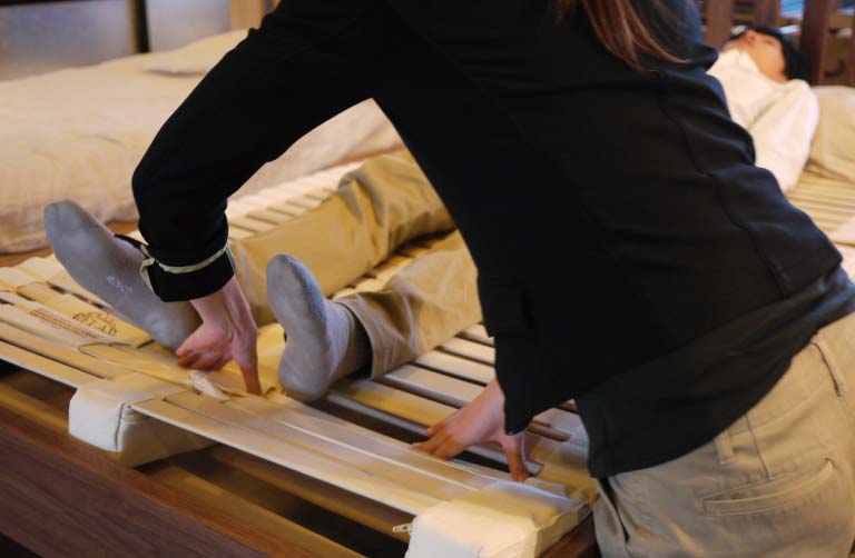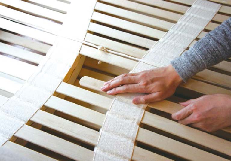 人の身体は千差万別で、自分の足に合う靴が人それぞれ異なるように、合う寝具も人それぞれ違います。ウッドスプリングは、足よりも更に複雑なラインを描く身体に合わせて一台一台をカスタマイズする、言ってみれば寝具の「ソール」部分。自分の足の形に合わせて靴を作る「オーダーシューズ」があるように、ウッドスプリングは、使う人の身体に合わせて調節を行い形作ることで、寝心地のベースを作ります。