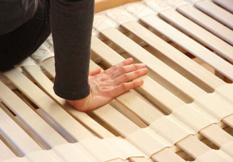 スイス・ヒュスラー社製。上げ下ろしをする敷ふとん(和布団)に合わせて使う日本仕様のウッドスプリングで、コンパクトに丸められる形状が特徴です。厚みのある楕円柱状の板(トリメール板)がしっかりと身体の重みを受け止め、床のかたさや冷えを感じやすい敷ふとんの寝心地を向上させます。ベッドフレームに載せて使うのもおすすめです。