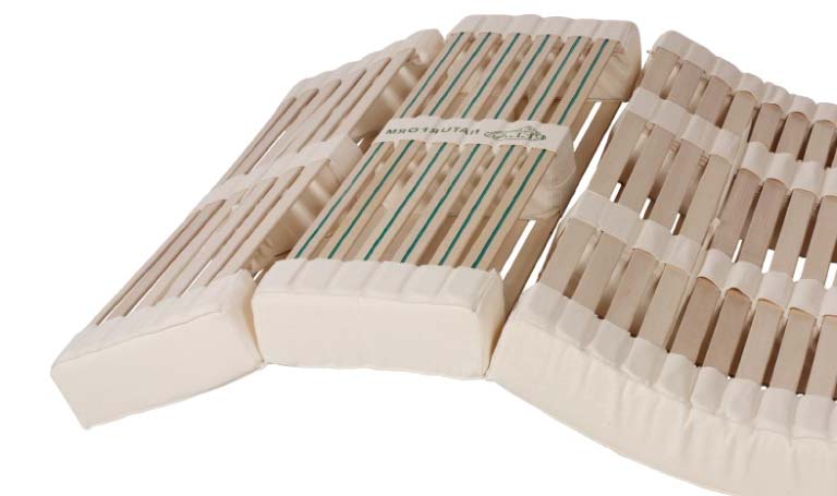オーストリアRELAX社製。楕円形の木盤一つひとつが独立し円を描くように柔軟に動くことで、あらゆる体勢や体格を受け止め寝返りまでもサポートします。腰周辺にはラテックスゴムのバーが入り、よりしっかりと支えます。ラバーピンのテンションを変えることで樹脂クッション(ハイトレル)のかたさ調節が可能。移動のしやすい3分割のつくりです。