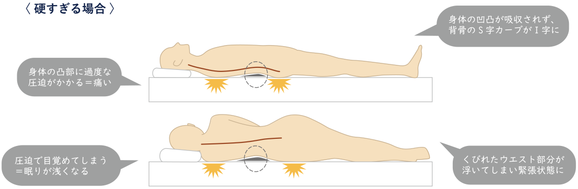 ただ、身体の凸部だけがマットレスに接地し、そこだけで重い体重を支える状態となり、ウエストのような細くくびれたところは隙間が空いてしまいしっかり支えることができません。肩や背中、お尻などの凸部分ばかりに身体の重みが集中し、血行不良や寝姿勢の歪みを招くことがあり寝疲れをおこしやすくなります。幅や厚みのある肩やお尻がしっかり受け止められていないと肝心のウエストから腰にかけてが浮いてしまうことになり、腰痛の負担が増すことになりかねません。