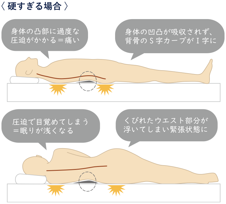 硬いマットレスは確かに背骨のラインが船底状になってしまうことは防ぎます。