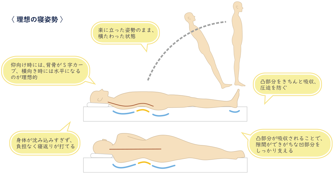 ヒトは寝ている間、無意識に寝返りを打ちさまざまな姿勢をとります。仰向きしかしない、あるいは横向き寝しかしないという人はいません。それぞれの寝姿勢、さらに体型の凹凸や寝返りなどの動きに応じてマットレスがどのように受け止めてくれるかが、心地よい眠りのための重要なポイントになります。