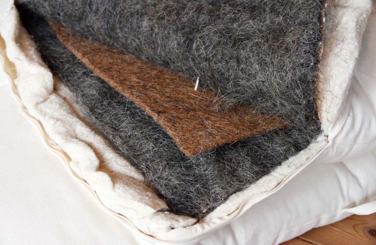 中わたも、吸湿発散性にすぐれた綿や麻など天然繊維のものが適していますが、中でもおすすめは獣毛(ウール)です。動物がはげしい寒暖差から自分の身体を守るためのもので、暑さ寒さ両方に対応できるよう特に進化しています。しかしながら、機能に優れた獣毛は気軽に洗濯できないのが難点。お手入れのしやすさでは、テンセルや綿の中わたもおすすめです。