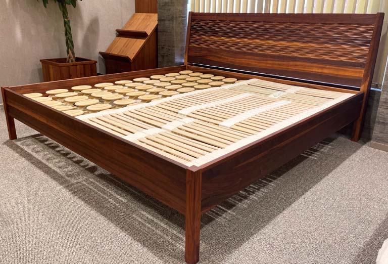 製作を委託している家具メーカーがあるのは、古くからの家具の産地、福岡県大川市や愛知県岡崎市など。家具づくりの優れたノウハウで、形状の特殊なウッドスプリングから一般的な敷寝具まで、合わせる寝具によって様々な対応が可能です。角を丸く落とす加工や脚高が選べるなど、使うシチュエーションをもとに細かなカスタマイズのできるタイプもあります。