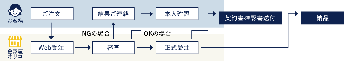 株式会社オリエントコーポレーション(以下オリコ)の規定によるローン契約審査のあと、オリコからご本人様確認のメールもしくはお電話を差し上げます(通常お申し込み日当日もしくは翌日)。