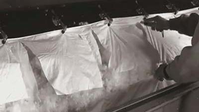 羽毛ふとんのマスを裂き、中の羽毛を取り出します。