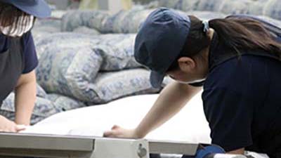 新しい側生地に羽毛を1マスひとマス丁寧に充填します。