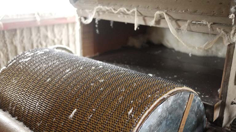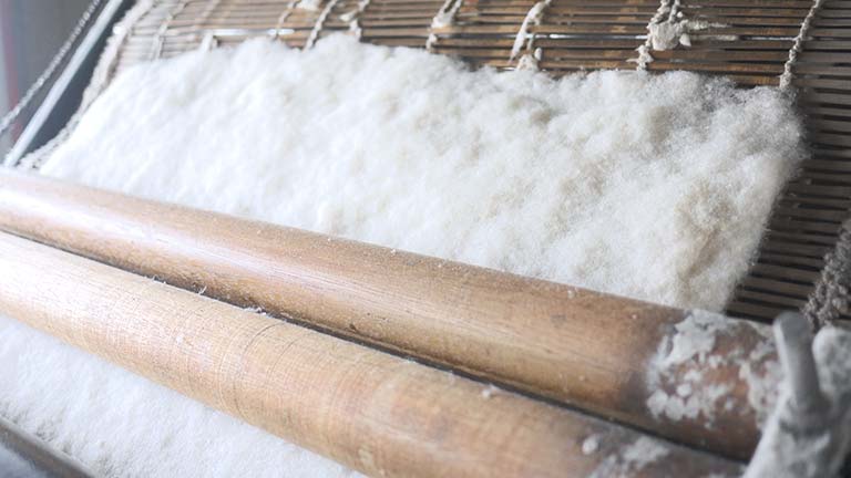 大きなローラーの表面から無数の針が生えているような機械にかけて、固く締まったわたをほぐします。